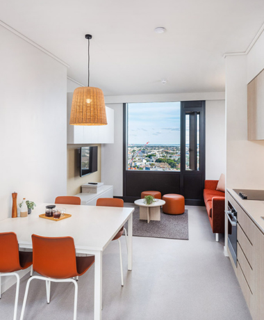 您可以選擇獨立套房或寬敞的合租公寓,享受舒適安全的學生生活。附設專屬學習空間、健身房、社交區域和戶外庭院,所需一切,盡在家門。